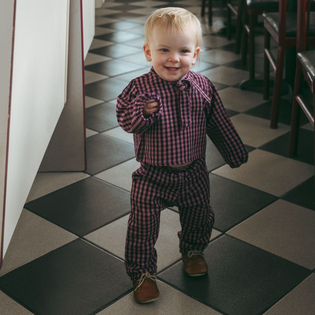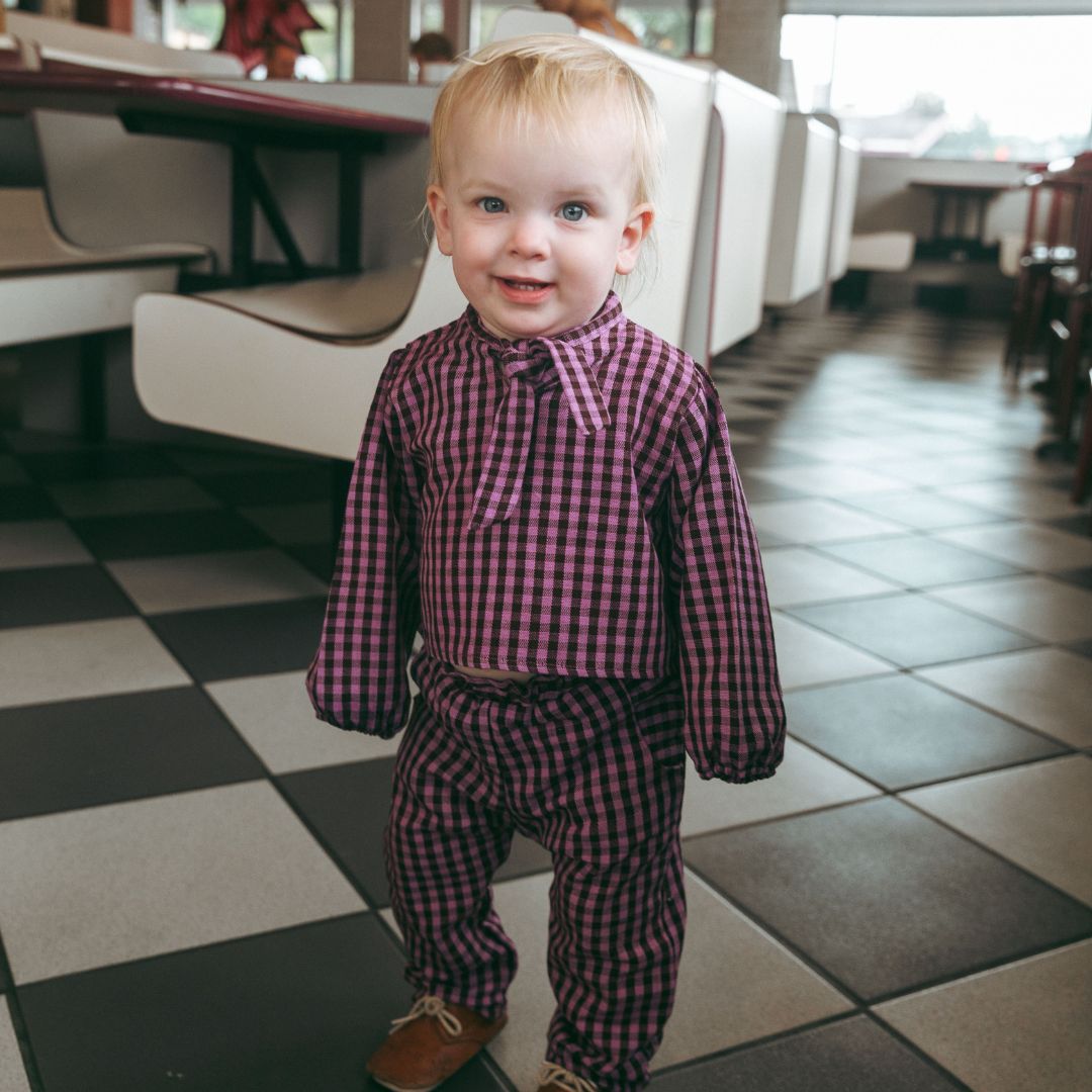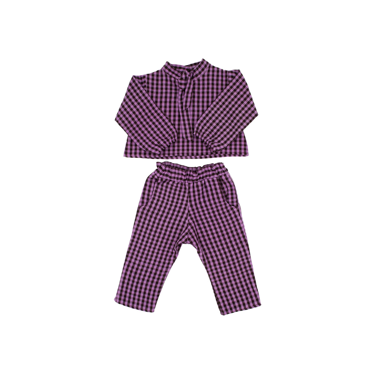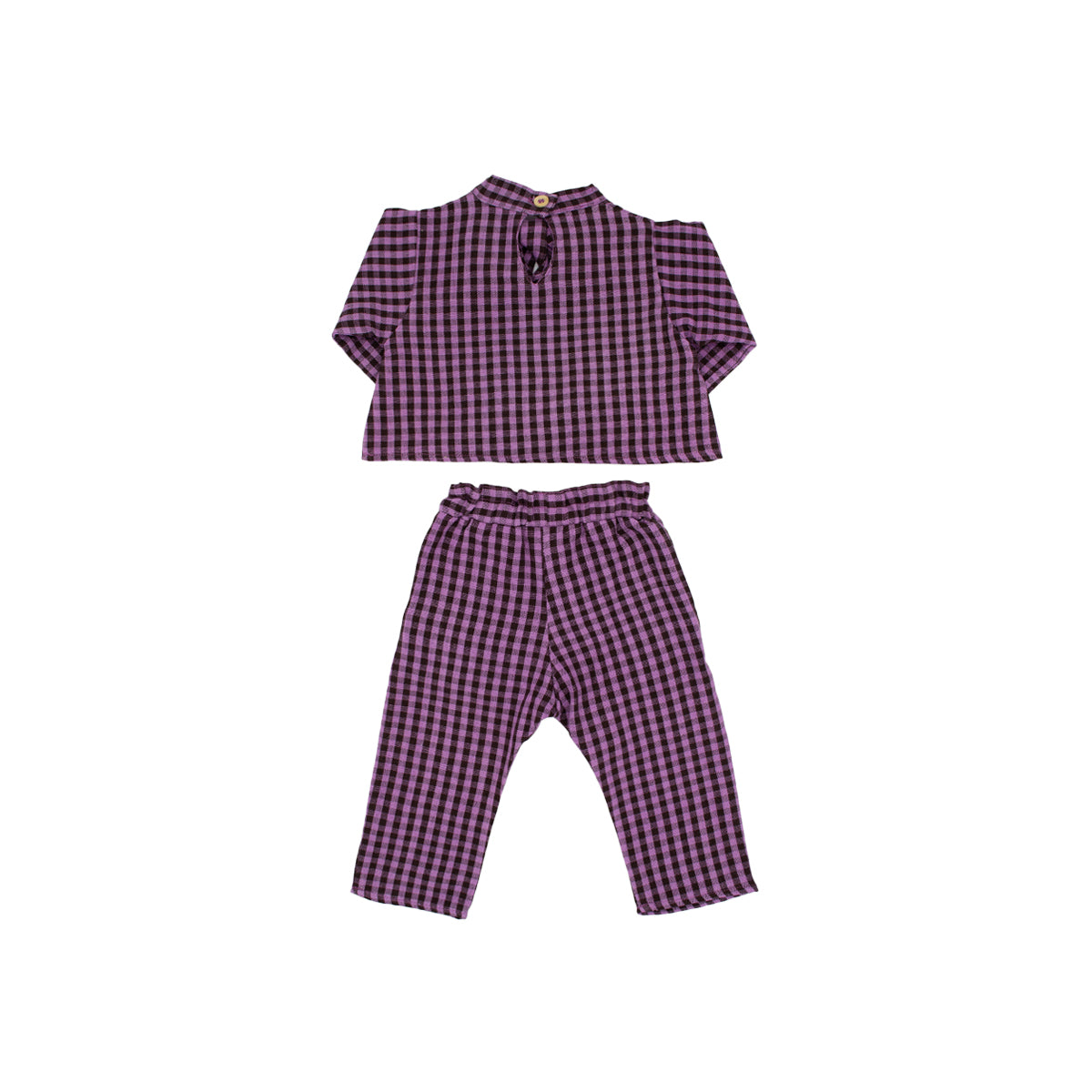 Meet our Mini Pearl Baby Pants Set, the ideal companion to the Big Sister Pearl Dress. This charming set includes a top with a tie neckline and a convenient back button closure for effortless dressing. Paired with gently elasticized pants, both pieces showcase a lovely neutral check pattern, creating a coordinated and stylish look for your little one.