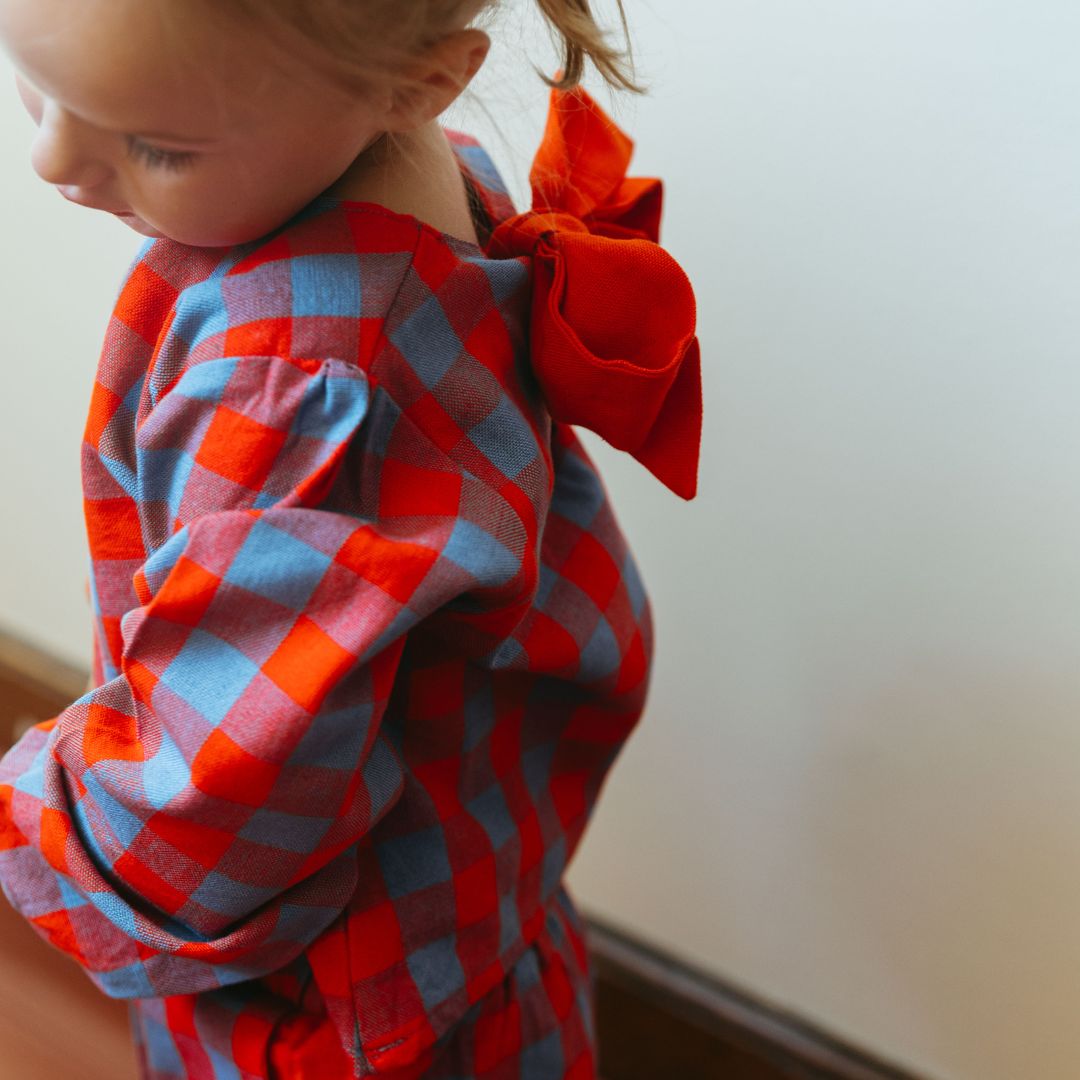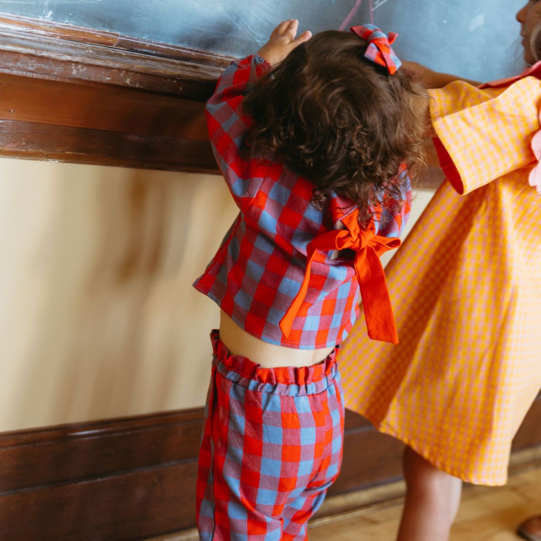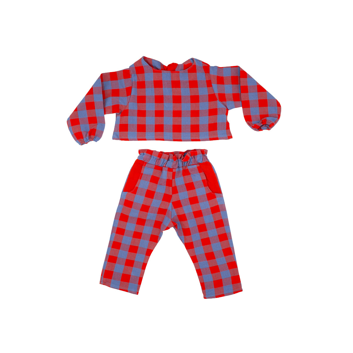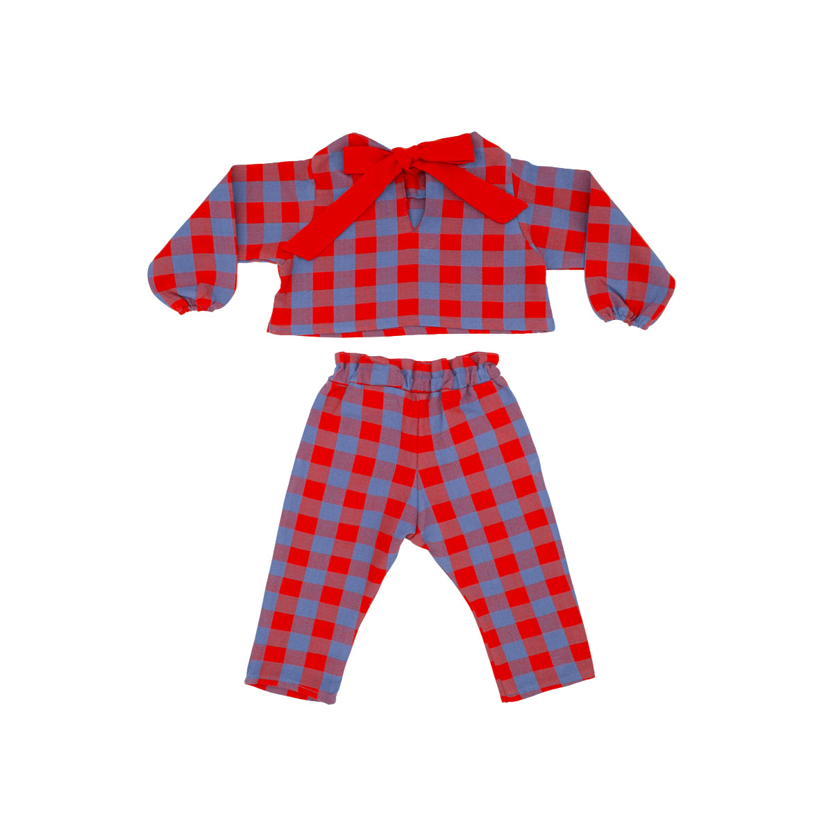 The Simone set features long sleeves an adorable back bow is visible on the back for a feminine touch. Gently elasticized pants with paper bag waist trimmings and pockets make the outfit more versatile and comfortable.