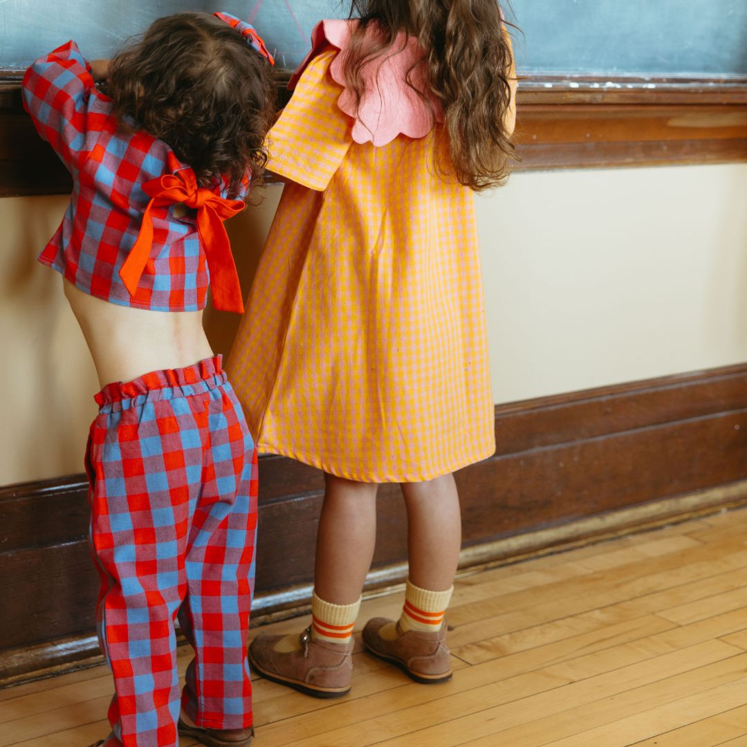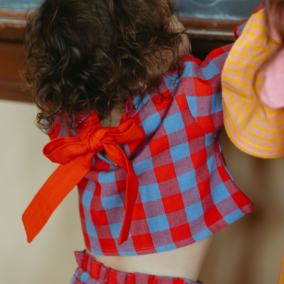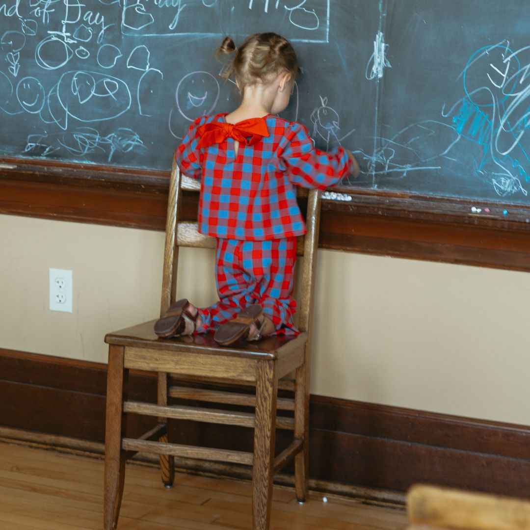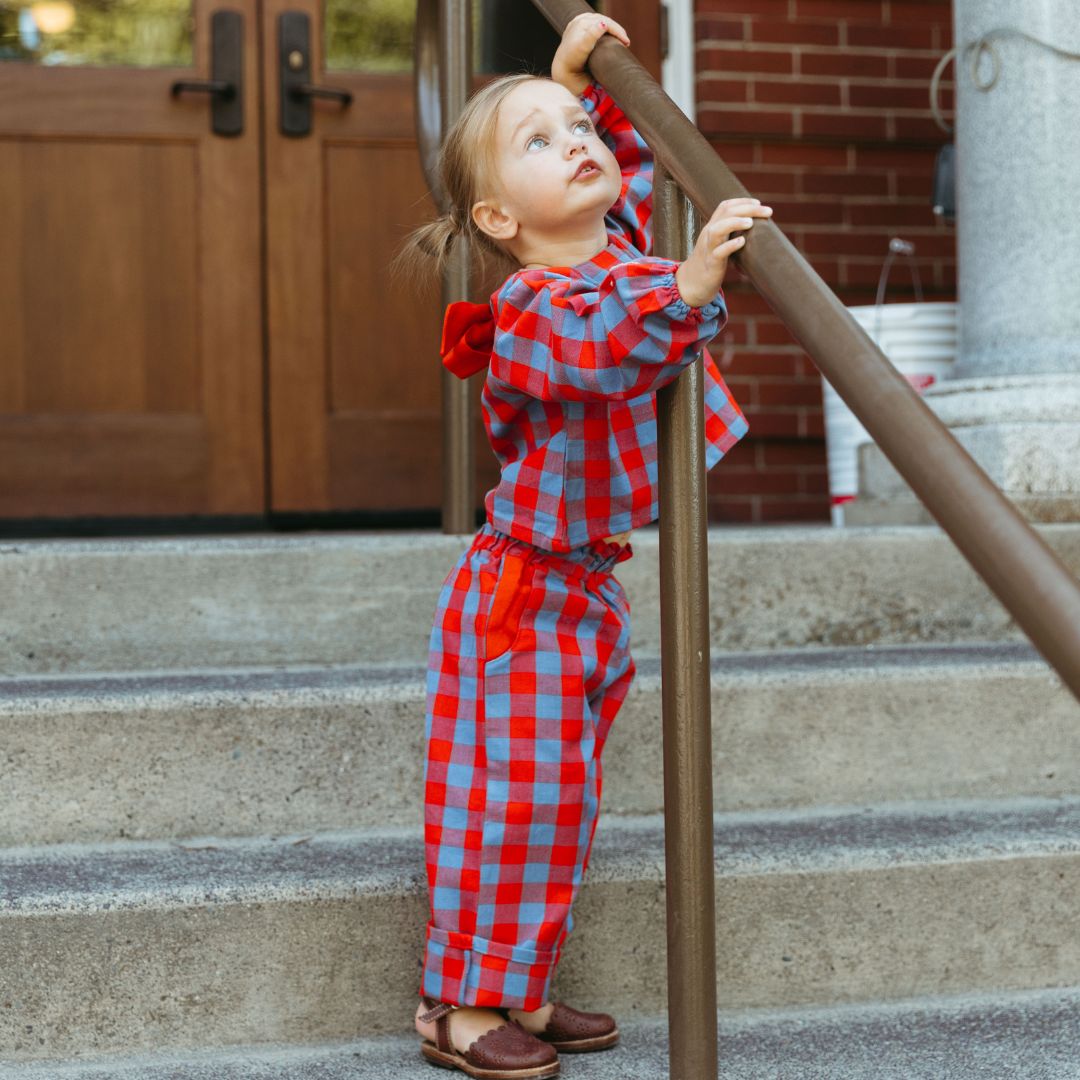 The Simone set features long sleeves an adorable back bow is visible on the back for a feminine touch. Gently elasticized pants with paper bag waist trimmings and pockets make the outfit more versatile and comfortable.