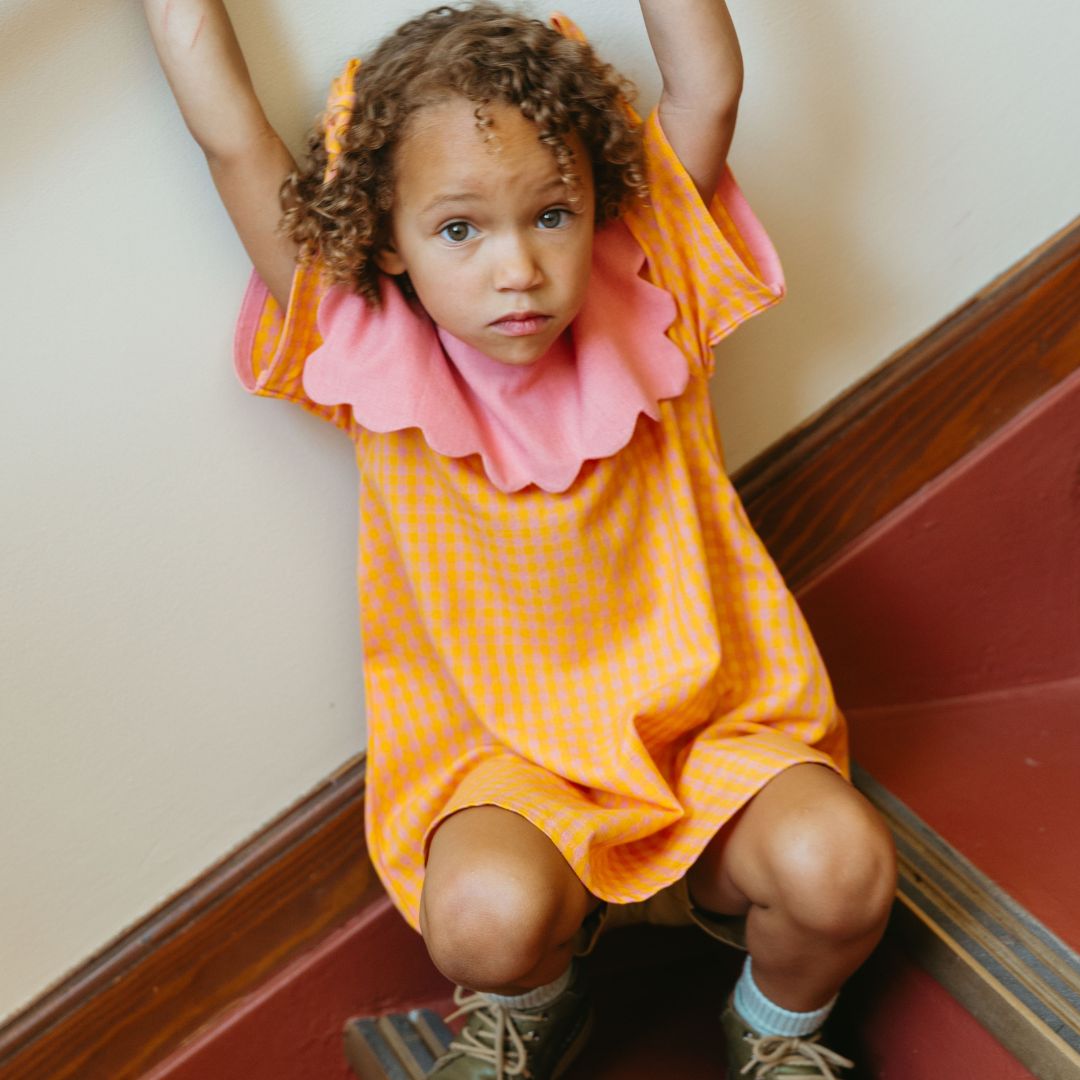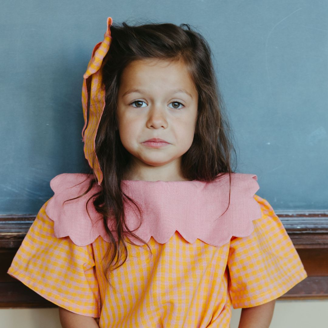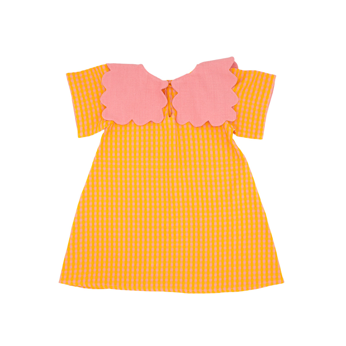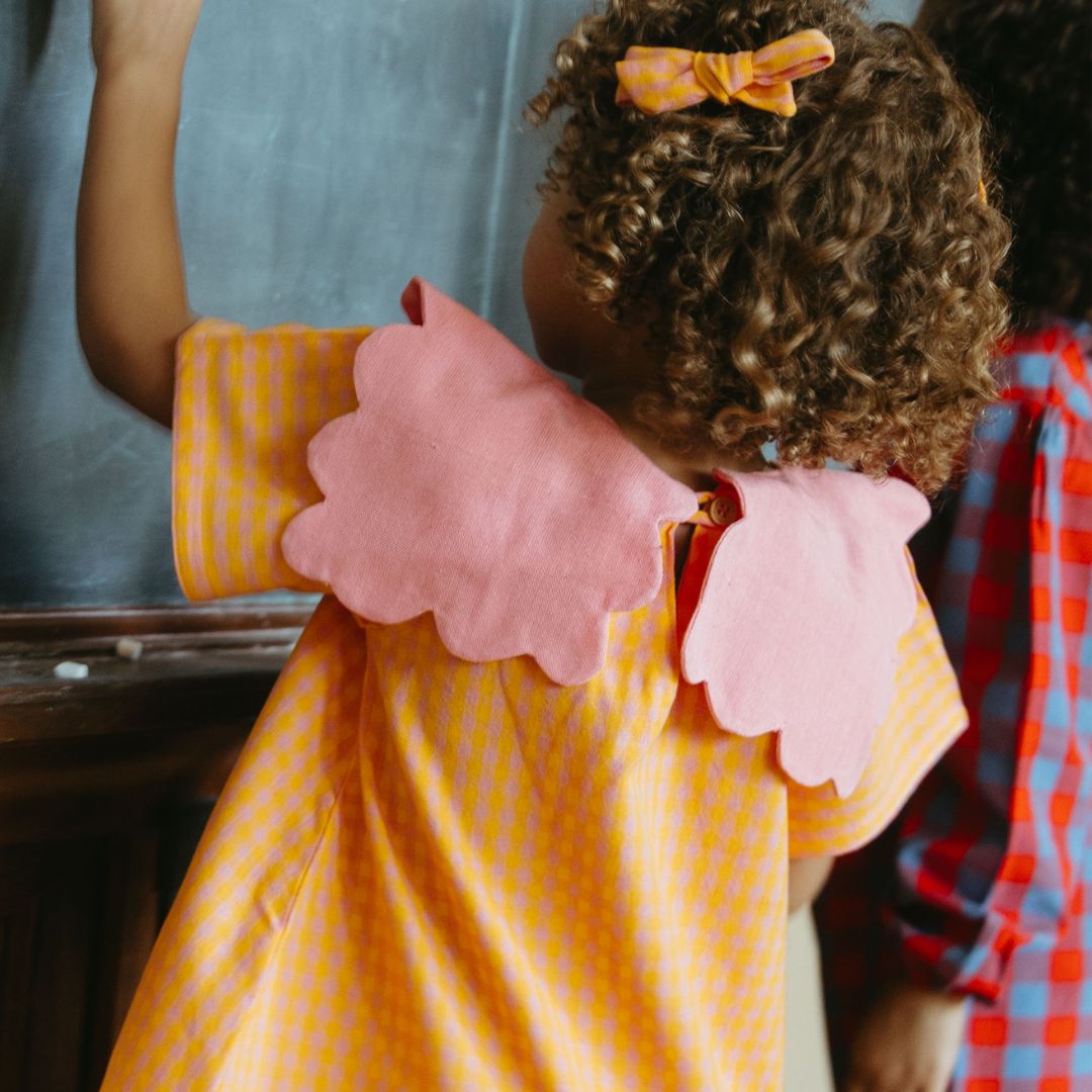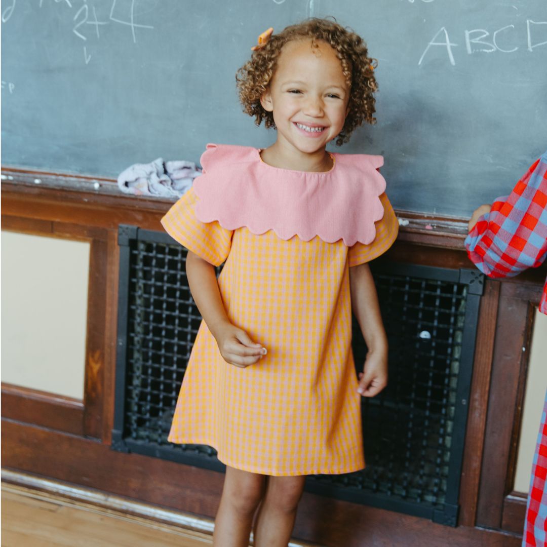 This updated version features a playful scalloped bib collar in contrasting cotton and a single button-back closure for easy dressing. Made in our signature checkered textile, it keeps the same comfy, A-line fit you know and love from our Mabel and Eden dresses. A standout piece that’s equal parts charming and practical.