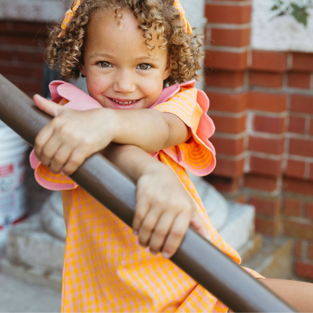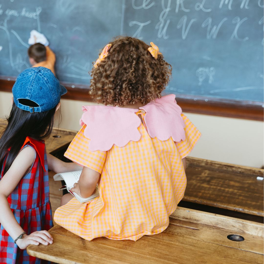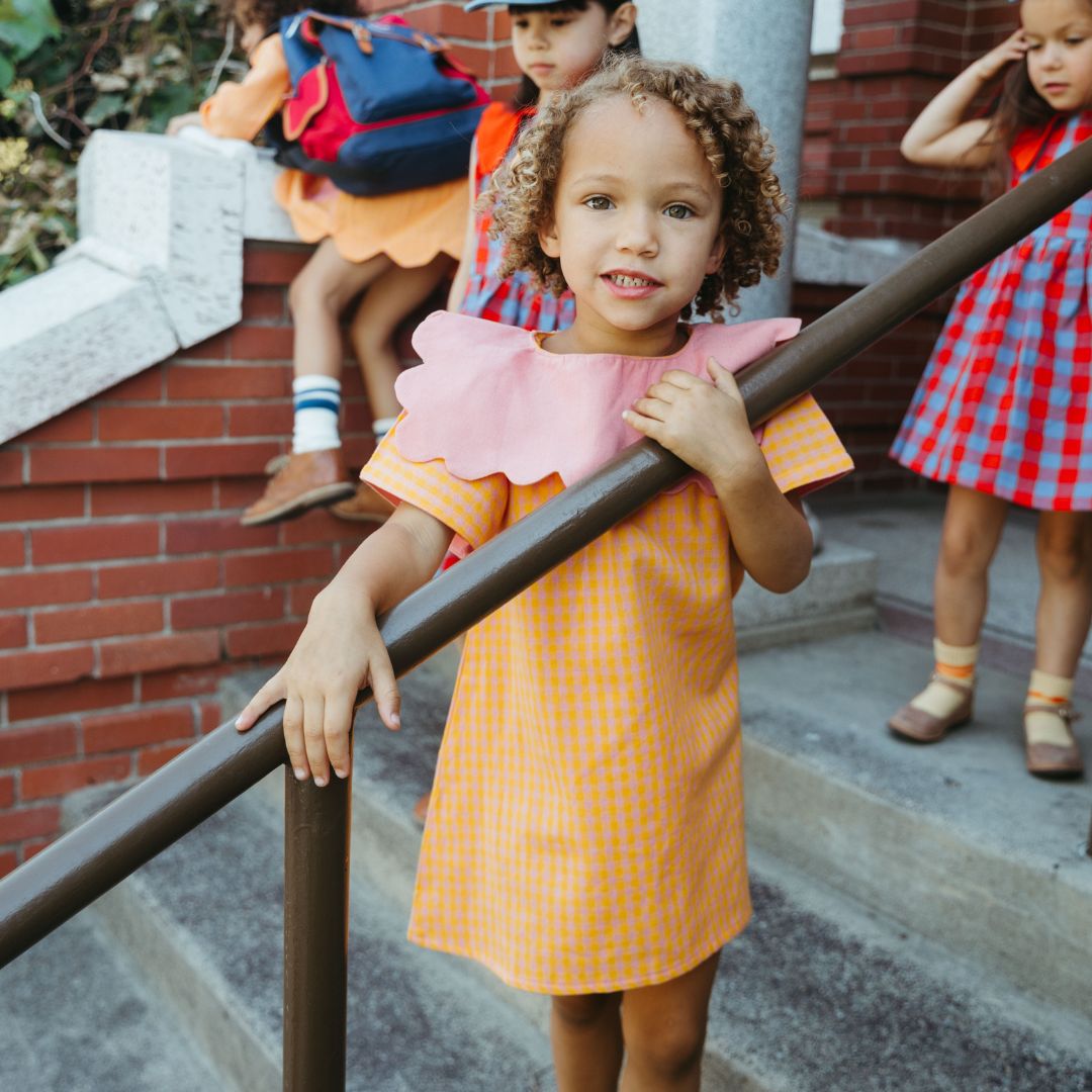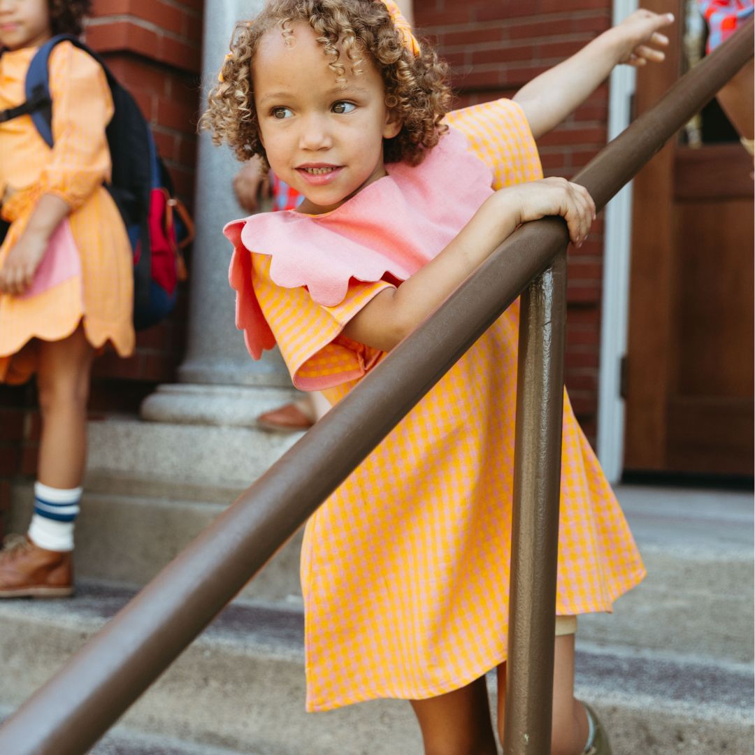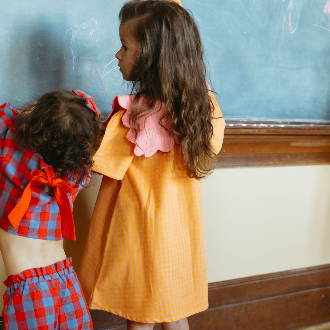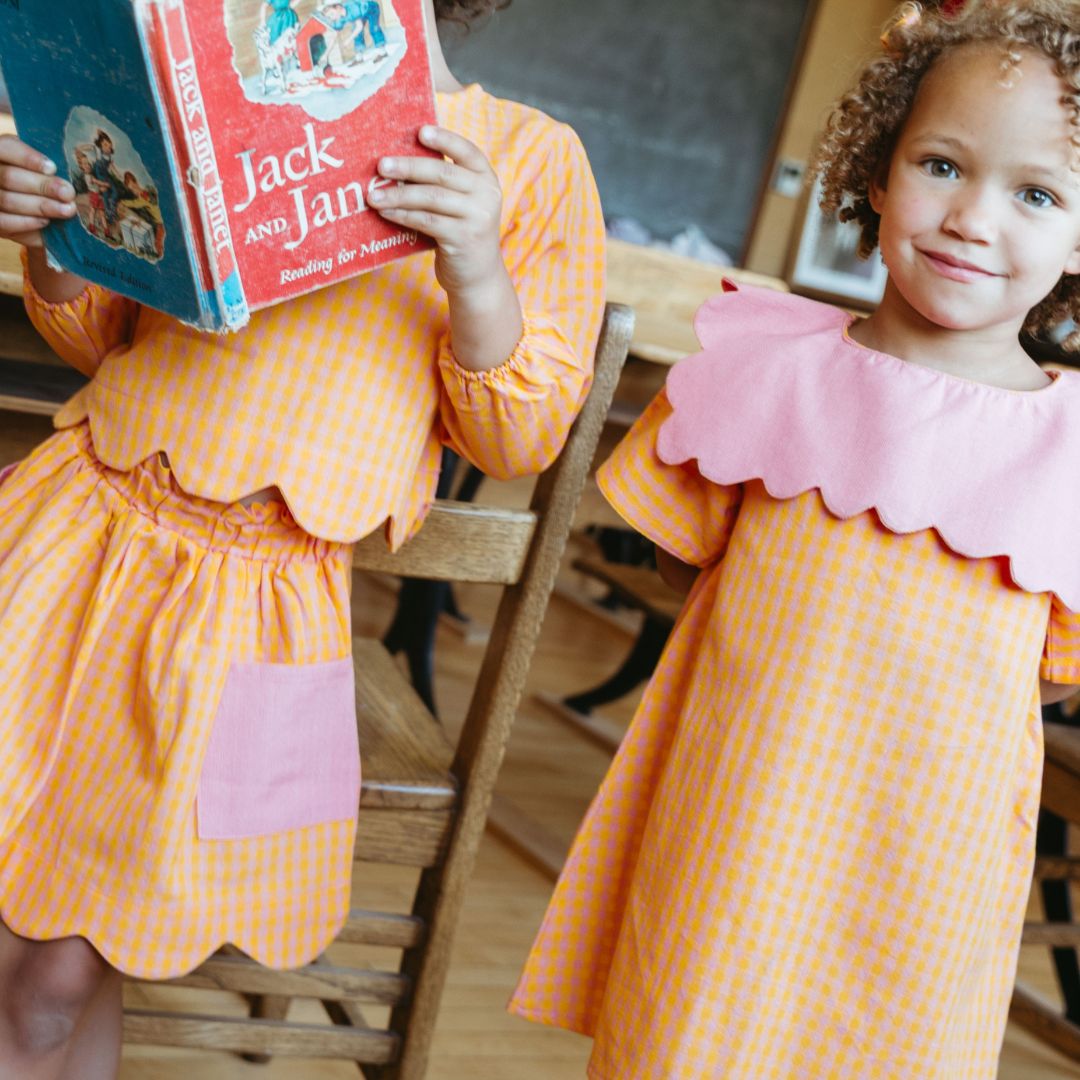 This updated version features a playful scalloped bib collar in contrasting cotton and a single button-back closure for easy dressing. Made in our signature checkered textile, it keeps the same comfy, A-line fit you know and love from our Mabel and Eden dresses. A standout piece that’s equal parts charming and practical.