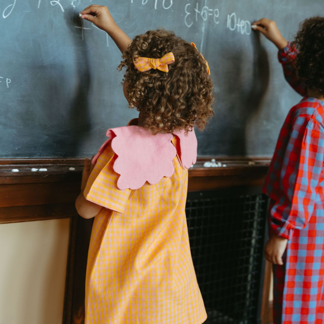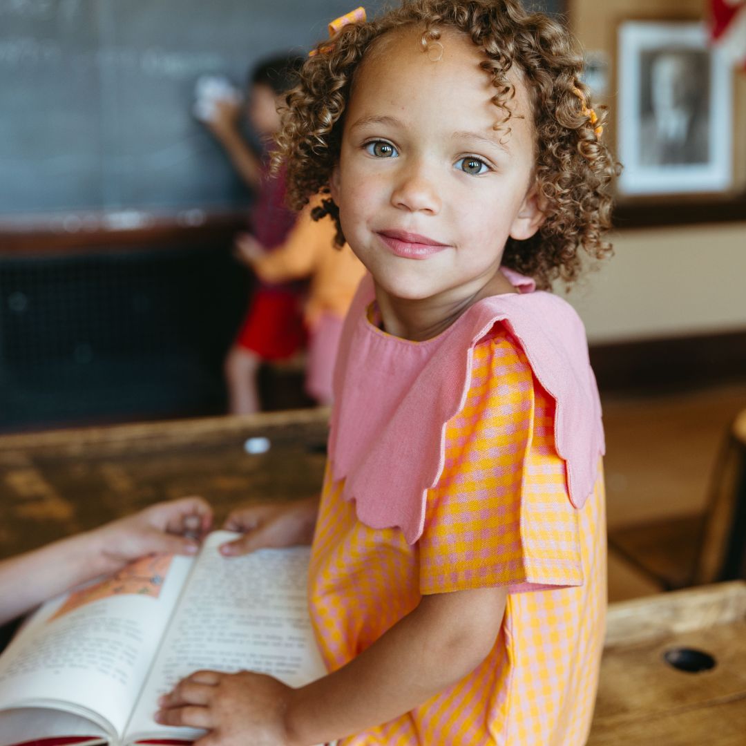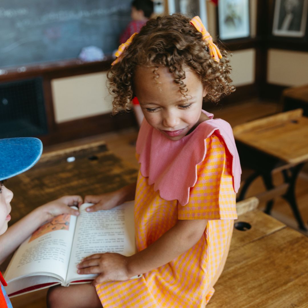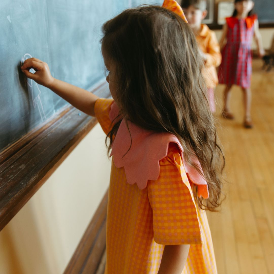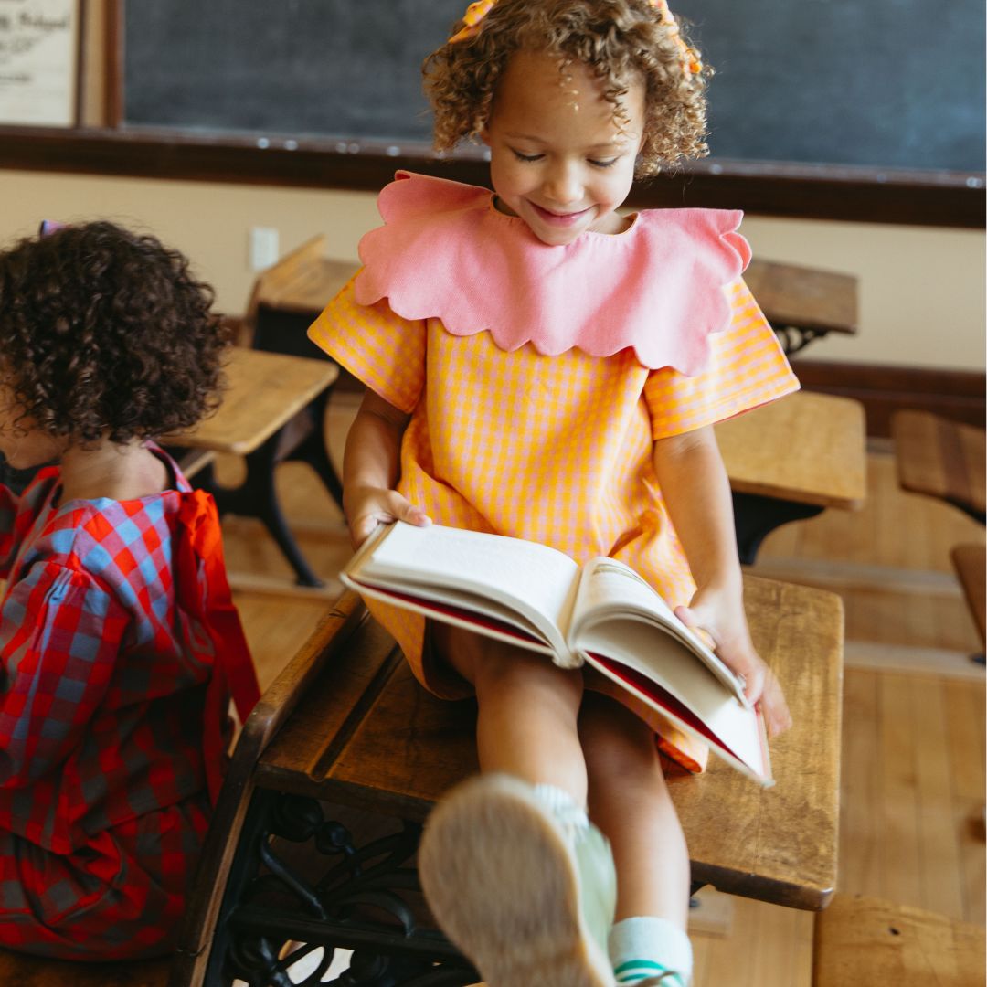 This updated version features a playful scalloped bib collar in contrasting cotton and a single button-back closure for easy dressing. Made in our signature checkered textile, it keeps the same comfy, A-line fit you know and love from our Mabel and Eden dresses. A standout piece that’s equal parts charming and practical.