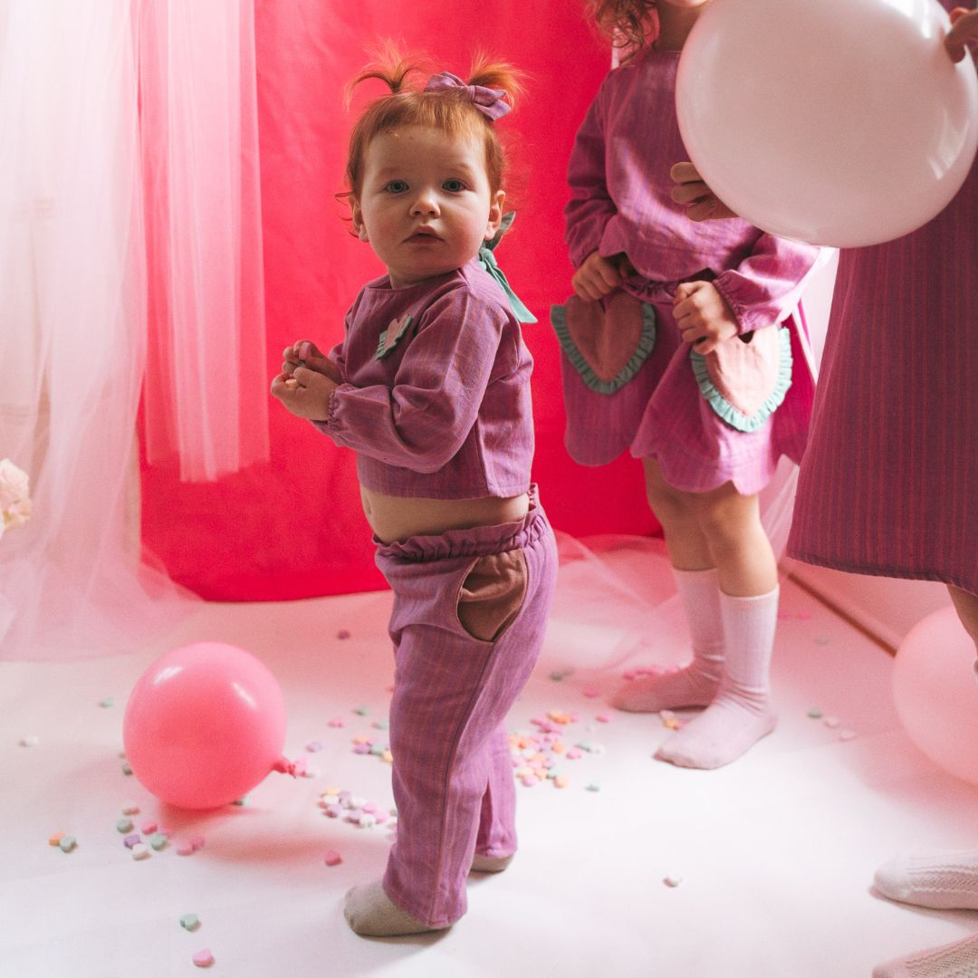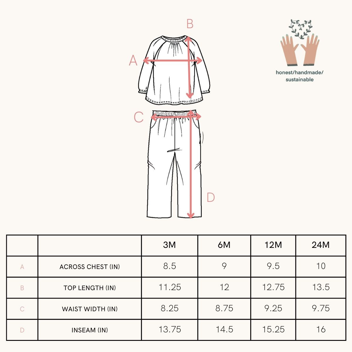 The Simone set features long sleeves an adorable back bow is visible on the back for a feminine touch. Gently elasticized pants with paper bag waist trimmings and pockets make the outfit more versatile and comfortable.