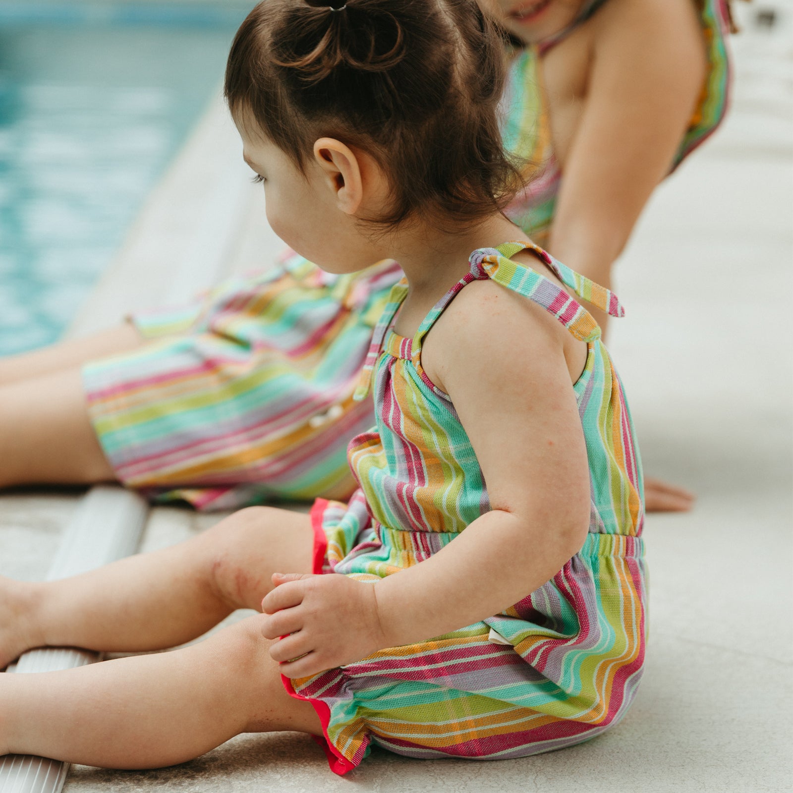 The Poppy Jumper is designed for the active yet stylish baby. This piece features a gentle elastic waistband, adjustable shoulder straps, and inseam buttons for breezy changes. The jumper is finished with leg ruffles for girly touch. The fabric is 100% handmade and will keep your baby cool all summer long.