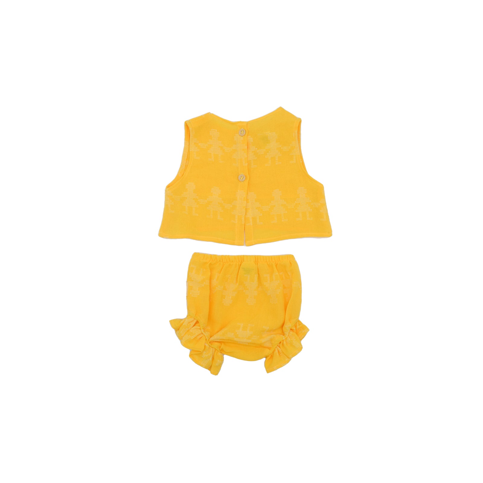 This sweet two piece set is made with our super soft gauzelike fabric, perfect for her delicate skin. The top features back buttons and an interior layer for extra coverage. Bloomers are gently elasticized for comfort.