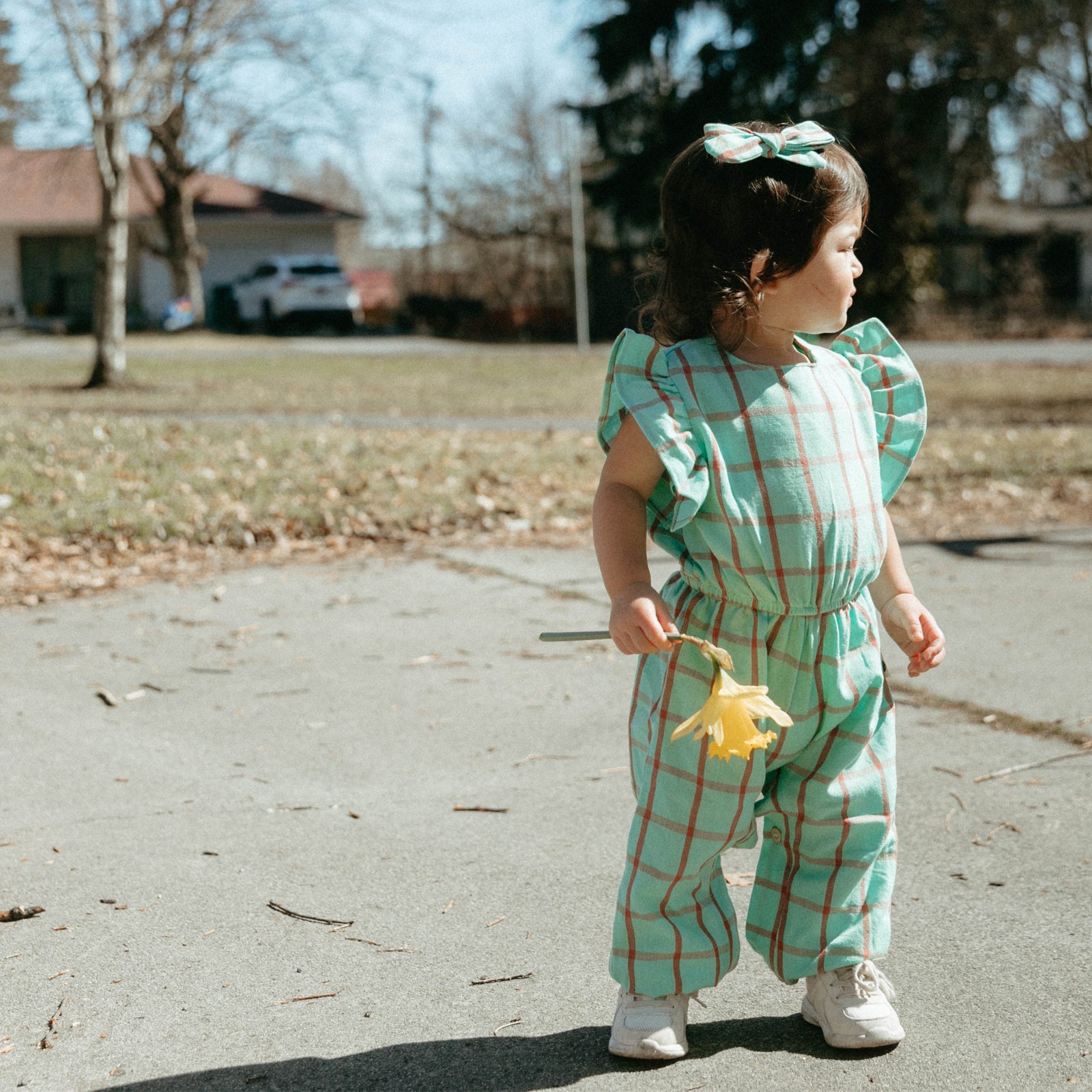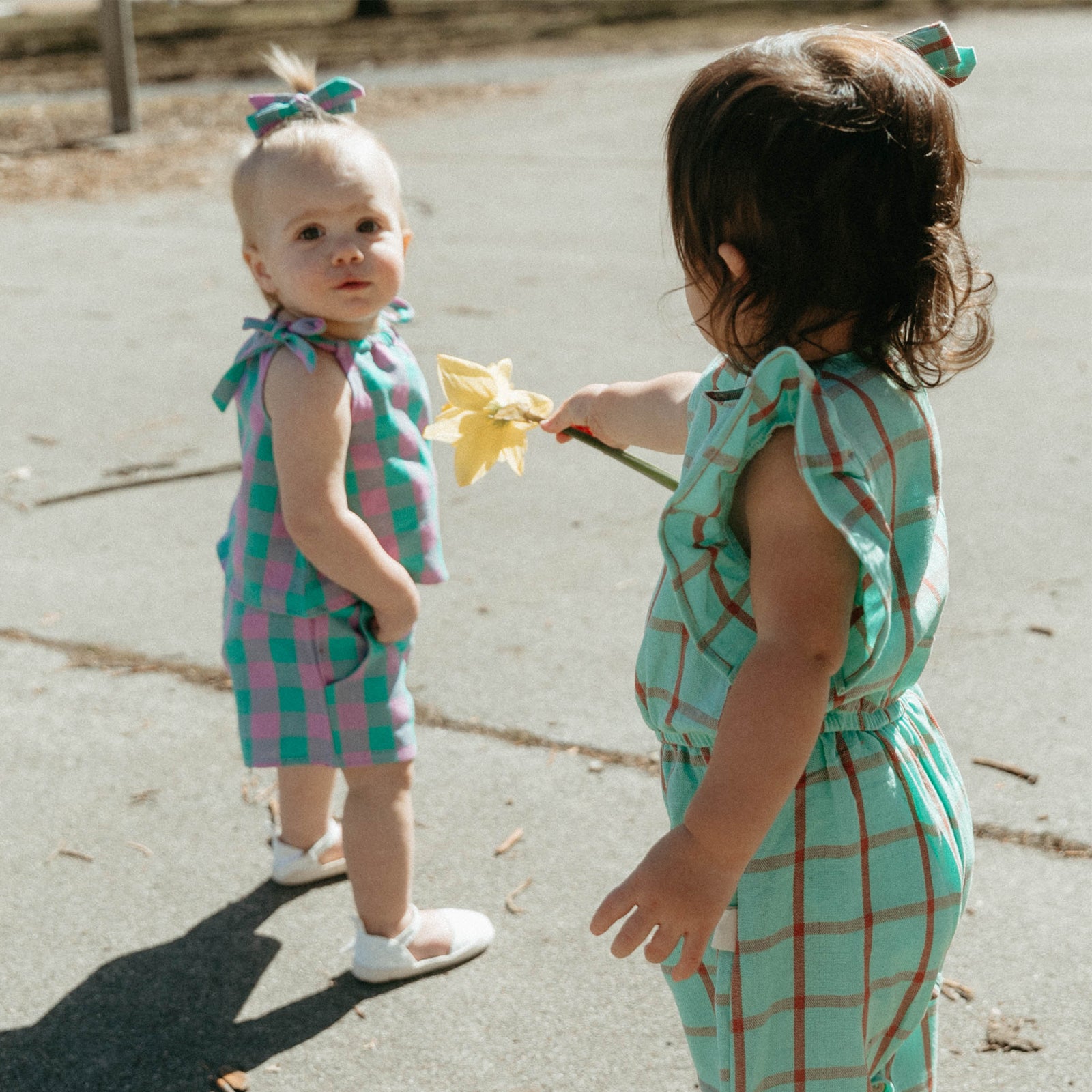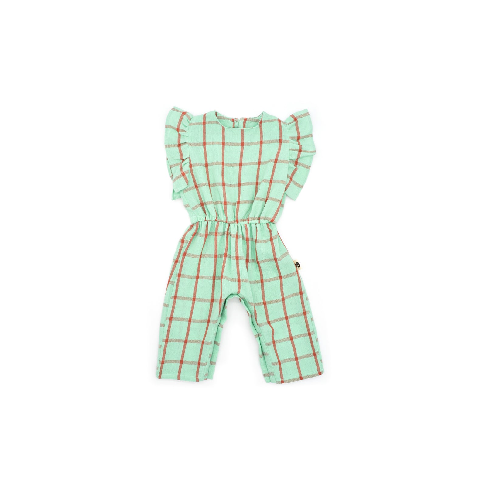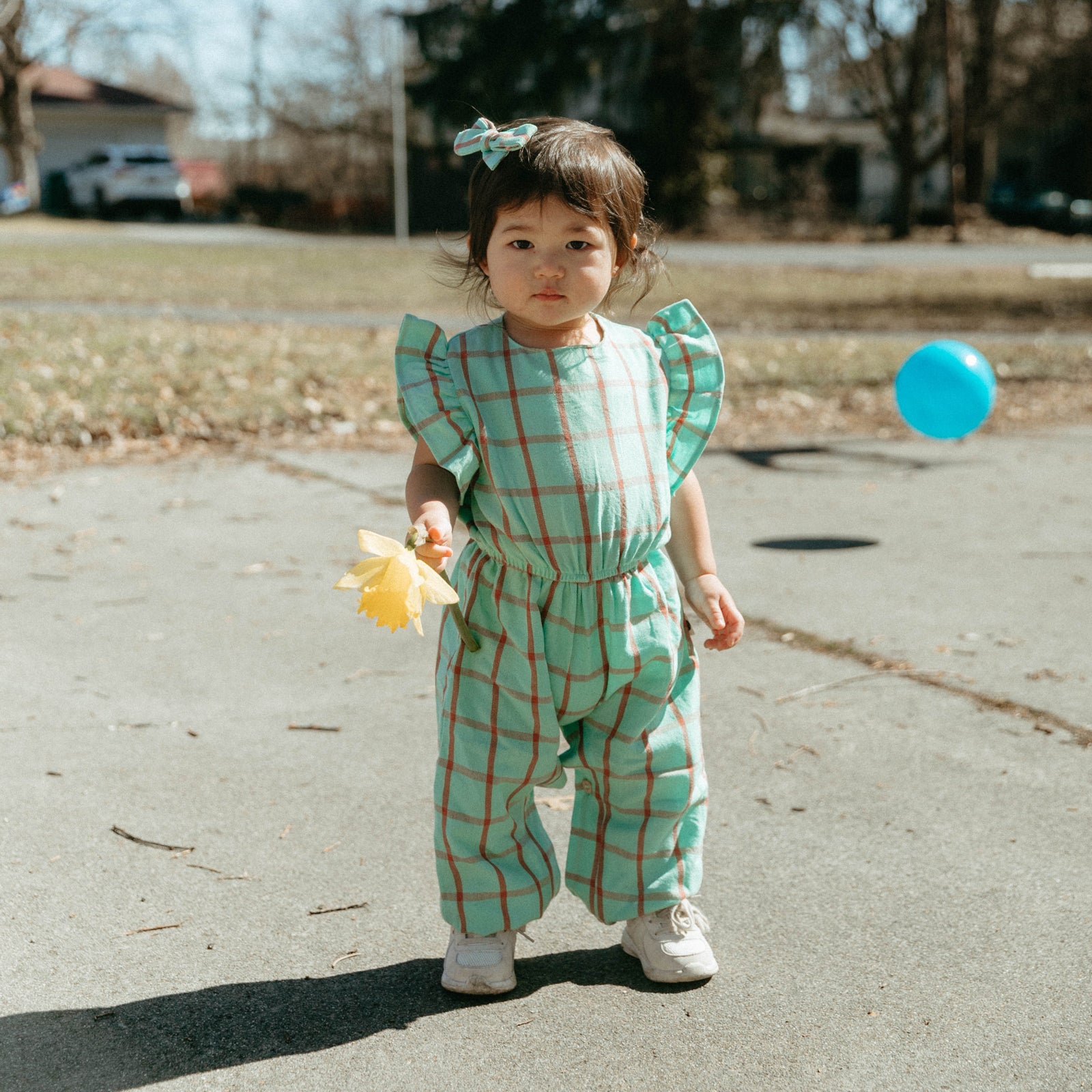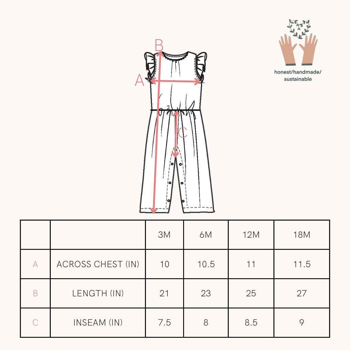 The Willow jumpsuit in our lightweight fabric features ruffled sleeves and a gently elasticized at the waist for comfort.